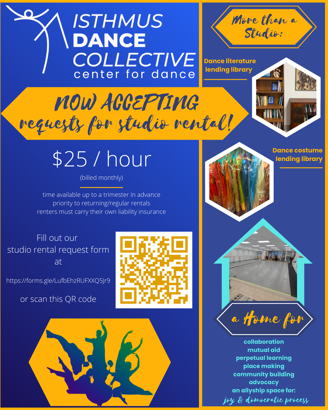 Welcome! We are the Isthmus Dance Collective - a community of dance artists that has come together to support and expand vibrant local dance by supporting each other and working together democratically. Get involved, join our effort! Dance is part of who we are and who we want to be as individuals, as a community, as humans. So whether you are a dance artist yourself, a dance lover, or you're curious to learn more about dance, we'd love for you to get involved.